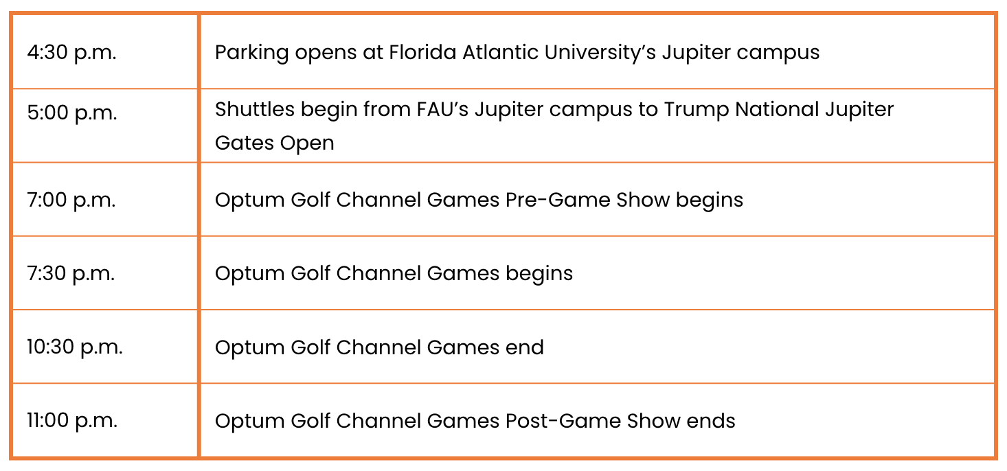 Get ready for an unforgettable night at the Optum Golf Channel Games. We’re excited to welcome you to Trump National Golf Club for a first-of-its-kind competition featuring golf’s biggest stars, electric challenges, and an atmosphere unlike anything the sport has seen. To help you make the most of your experience, we’ve pulled together all the essential details—from arrival and parking to food, beverages, and on-site amenities—so you can enjoy the event with confidence.